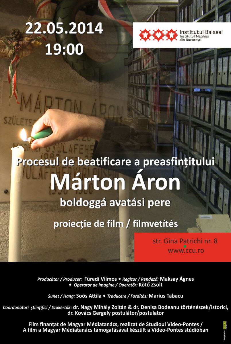 2014. május 22.: Este 7 órakor a Balassi Intézet - Bukaresti Magyar Intézetben bemutatják Maksay Ágnes dokumentumfilmjét Márton Áron boldoggá avatási peréről. Sajtóközlemény Plakát Beszámoló Beszélgetés a zsidókat mentő Márton Áron püspökről