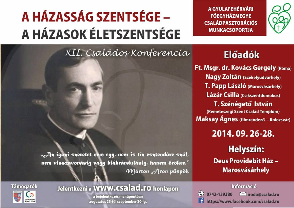 2014. szeptember 26-28.: A gyulafehérvári főegyházmegye XII. Családkonferenciája Marosvásárhelyen. A három nap célja, hogy a résztvevő házaspárok jobban megismerjék Márton Áron életét és tanítását. Program Plakát Beszámoló