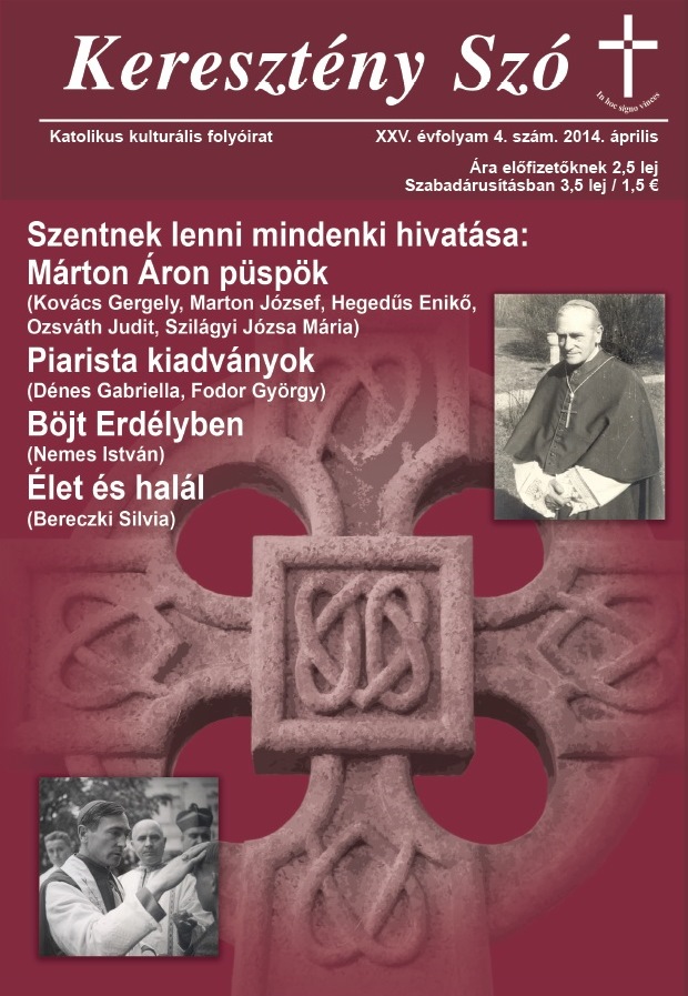 2014. április: A Keresztény Szó áprilisi száma több tanulmány és írás által emlékezik a 75 éve püspökké szentelt Márton Áronra. Fedőlap.