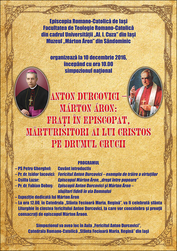 A Jászvásári Római Katolikus Egyházmegye, a jászvásári "Al. I. Cuza" Egyetem Római Katolikus Fakultása és a csíkszentdomokosi Márton Áron Múzeum országos szimpóziumot szervez 2016. december 10-én, szombaton. Az Anton Durcovici – Márton Áron: testvérek a püspöki szolgálatban, Krisztus hitvallói a kereszt útján című rendezvényre a jászvásári székesegyház "Anton Durcovici" termében kerül sor, 10 órai kezdettel.