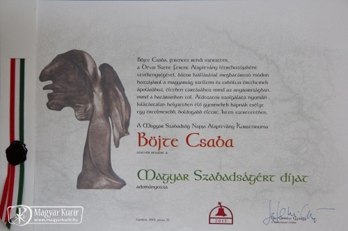 Böjte Csaba ferences szerzetes, a Dévai Szent Ferenc Alapítvány alapítója kapta idén a Magyar Szabadságért díjat. A díjat június 27-én, szombaton a gödöllői Szentháromság templomban adták át - tájékoztat az MTI.