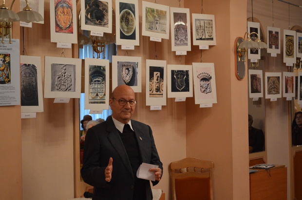A kiállított anyagot Asztalos Lajos helytörténész mutatta be, aki nemcsak a több mint 70 címer közül számosról beszélt, hanem a jelenlevőket elkalauzolta a heraldikának (címertannak), a történelem egyik segédtudományának rejtelmeibe. Nemcsak a címerelmélet, hanem a címerművészet több elemét is ismertette.