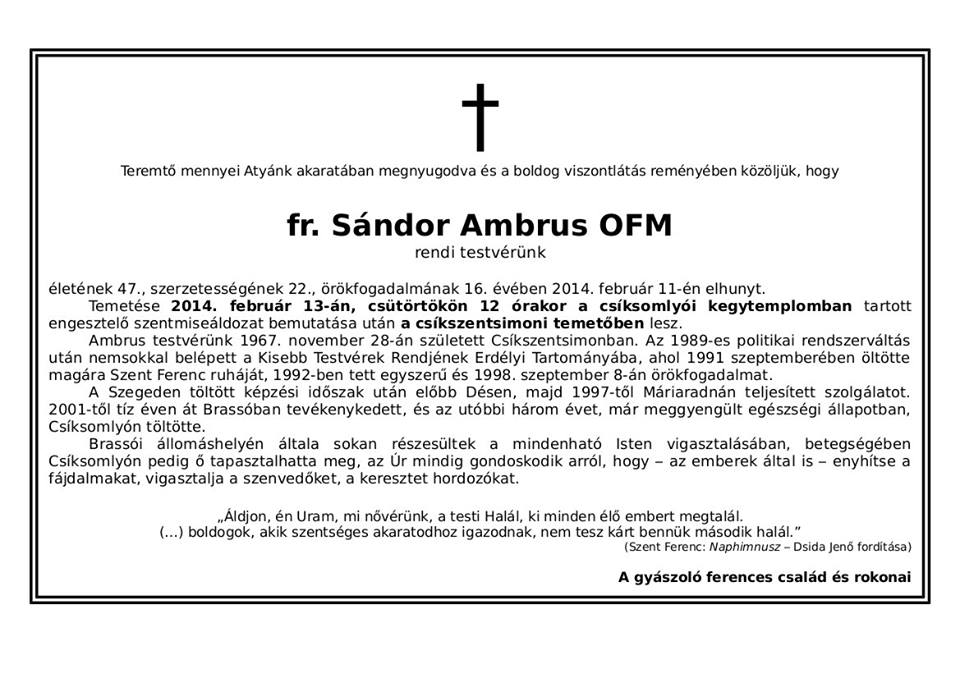 Brassói állomáshelyén sokan részesültek általa a mindeható Isten vigasztalásában, Csíksomlyón pedig ő tapasztalhatta meg, hogy az Úr mindig gondoskodik, az emberek által is enyhíti a fájdalmakat, vigasztalja a szenvedőket, a keresztet hordozókat. Fr. Sándor Ambrus temetése 2014. február 13-án, csütörtökön 12 órakor a csíksomlyói kegytemplomban tartott engesztelő szentmiseáldozat bemutatása után a csíkszentsimoni temetőben lesz.