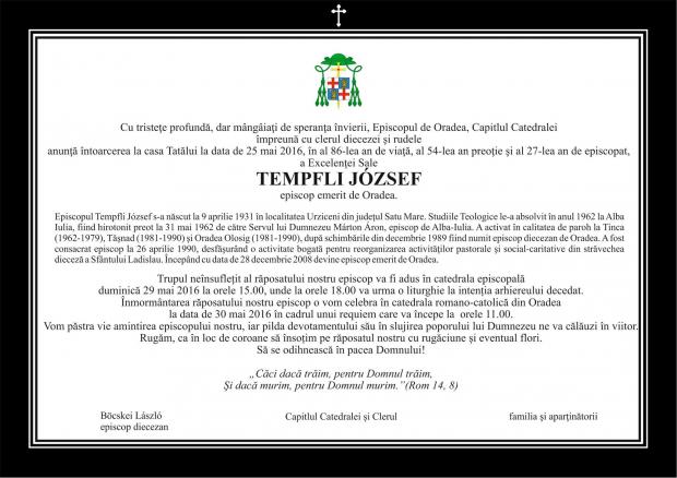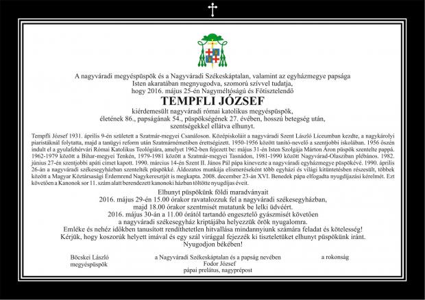 Május 25-én de. fél 11-kor örök nyugalomra tért Tempfli József nyugalmazott váradi püspök életének 86., papságának 54., püspökségének 27. évében, hosszú betegség után, szentségekkel ellátva.