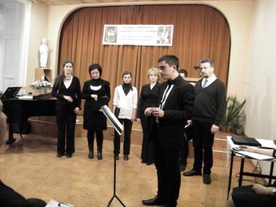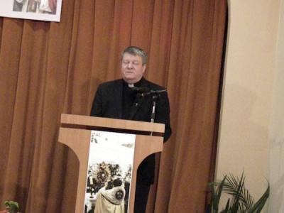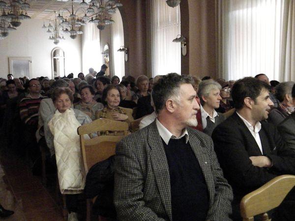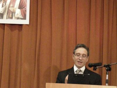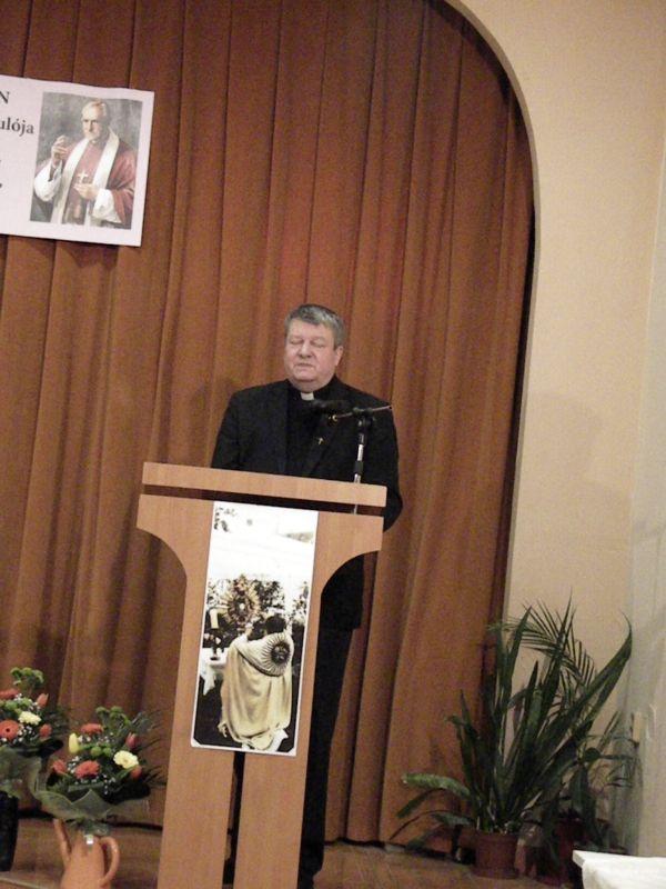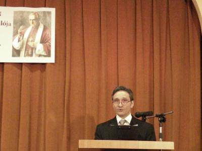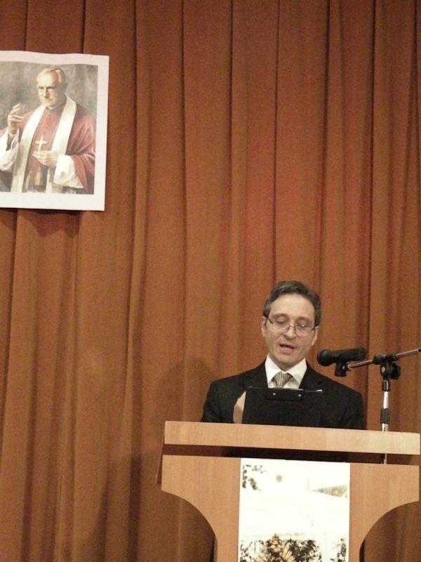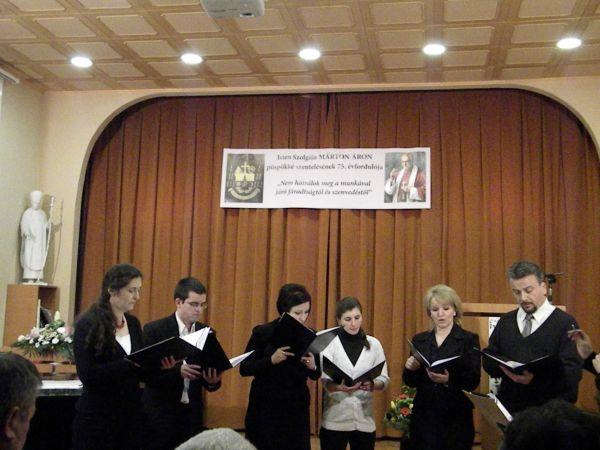 A bevezetőben Kovács Sándor főesperes-plébános mutatta be az előadást tartó professzort, kitérve egyházi pályája jelentősebb állomásaira. Ezt követően Marton József A 75 éve püspökké szentelt Márton Áron címen tartott átfogó előadást, amelyben a csíkszentdomokosi útkereséstől, a frontélményeken át a teológiáig vezető utat vázolta, a fiatal Márton Áron papi ténykedését, a püspöki élet nehézségeit, a börtönéveket s az azt követő, megszorításokban bővelkedő éveket is bemutatta. Minden szakaszból kiemelt néhány olyan elemet, amely a nagy püspök fejlődését mutatta, és tisztázott néhány gyakran ismételt félreértést is. Ugyanakkor rámutatott Márton Áron következetességére, munkabírására, helytállására, tisztánlátására, amely nem csak egyházi, de az erdélyi magyarság életkérdéseiben is megnyilvánult, s amellyel a kommunista hatóságok gyűlöletét, ugyanakkor azonban mint méltó ellenfél, a tiszteletét is kiváltotta. Előadása zárásaként a magyar szellemi élet nagyjaitól Márton Áronra vonatkozó jellemzéseket idézett. Mindezt kiegészítette és a képet teljessé tette Bogdán Zsolt, aki az ismert vagy kevéssé ismert szövegeket olyan művészi szinten adta elő, hogy még az olykor botladozó sorok is színnel teltek meg és elvarázsolták, meghatották az egybegyűlteket. A zenészek tolmácsolásában felhangzott az az Ave Maria is, amit Dan Mizrahi zsidó zeneszerző, Márton Áron egykori rabtársa a katolikus főpap kiválóságától áthatva írt emlékére. (BM)