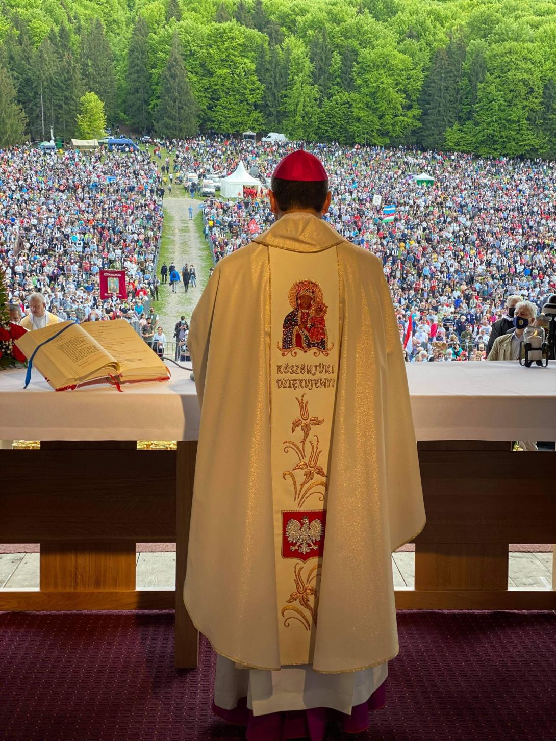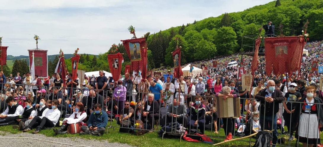 Az ünnepi szónok felelevenítette: „zarándokok ezrei kelnek útra. A keresztalják az Istenbe vetett győzelem erejét jelenítik meg és hirdetik. Örömünk jeleként lobogók sokasága leng a magasban, példaképeink és védőszentjeink pártfogása alatt, a zarándokló, élő és eleven egyház szent imádságai kíséretében.” Felidézte Márton Áron püspöknek az 1949-es, a gyimesi csángókhoz kapcsolódó csíksomlyói búcsús történetét, amikor Gyimesbükkben, zarándokbottal a kezükben, kordon vette körül a főpásztort, énekelve, imádkozva, minden lépésüket Isten oltalmába ajánlva óvták őt: együtt dobogott a nép és a főpásztor szíve.