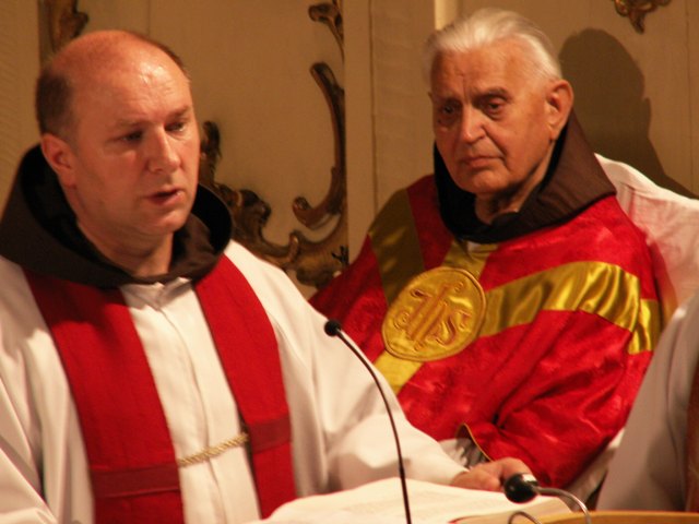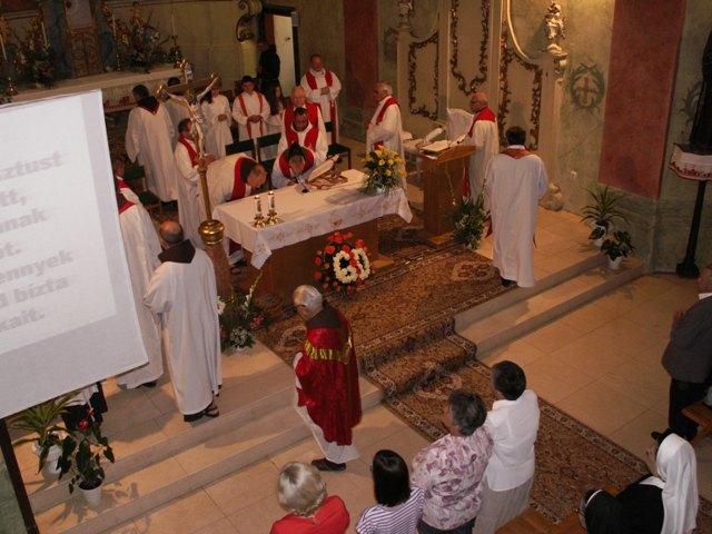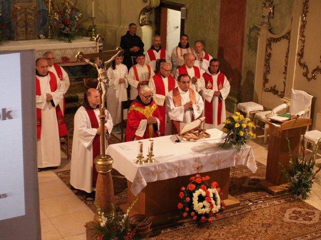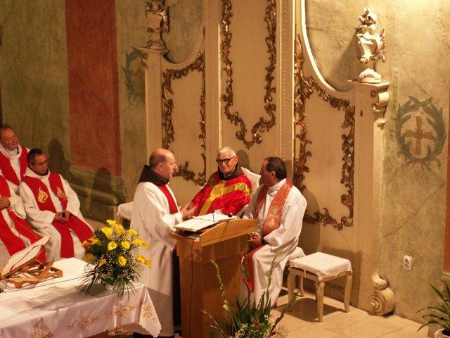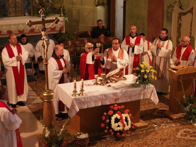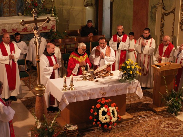 A kettős ünnep szónoka, Orbán Szabolcs, tartományfőnök a templom védőszentjeinek, Péter és Pál apostoloknak a jellembeli tulajdonságairól, erényeiről és esendőségeiről beszélt. Gyengeségeik, erősségeik ismeretében járták be azt a lelki utat, amelyet a Mester mutatott nekik. Hasonlóképpen Leonárd atya is. A szolgálati helyek, a kihívások más-más jó tulajdonságokat hoztak ki belőle – segítették jobbá válásában. A főatya egy jelképes ajándékkal lepte meg az ünnepeltet. Az öt tizedes rózsafüzérnek hatvan „szeme” van, így idén minden papi évért mondhat általa egy-egy imát. De a ferences rózsafüzér hét tizedet tartalmaz – egy ez alkalomra köttetettet nyújtott át, legyen min sorolnia a hálaéveket.