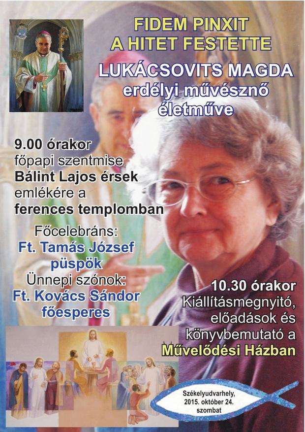1980-ban, éppen 35 éve alkotta meg Lukácsovits Magda festőművész a székelyudvarhelyi Szent Miklós-hegyi ravatalozó Krisztus feltámadása című hármasfalképét, valamint a végtisztességtétel eme hajlékát az általa tervezett liturgikus berendezéssel temetői kápolnává alakította. A munkára Bálint Lajos, akkori főesperes kérte fel, aki 1991-től a Gyulafehérvári Főegyházmegye első érseke volt, és 5 évvel ezelőtt halt meg. Az évfordulók alkalmával október 24-én, szombaton Székelyudvarhelyen főpásztori szentmisére, életmű-kiállítás megnyitására, album- és könyvbemutatóra kerül sor. A rendezvénysorozat fővédnöke Tamás József segédpüspök, védnöke Urbán János, Erik testvér, érseki helynök.