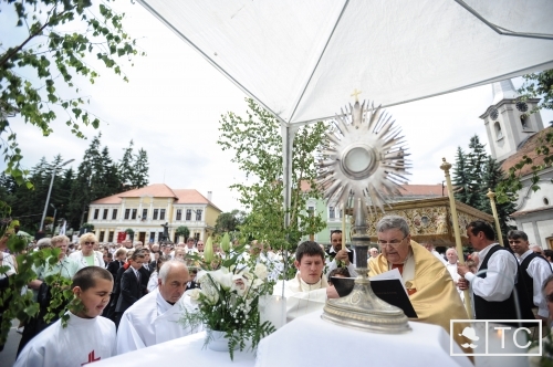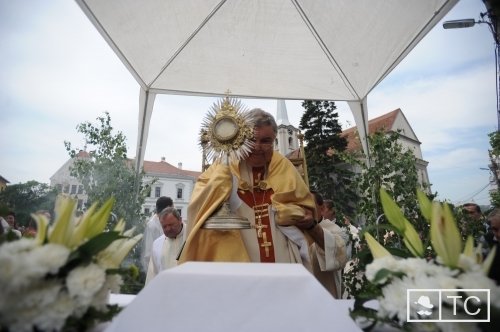 Az Úr Testének és Vérének főünnepére hangolt az ünnepélyesség, a fel-felhangzó csengettyű-, ének- és imaszó: lobogók alatt vonultak a keresztalják a Márton Áron téri főpásztori szabadtéri szentmisére, utána a négy égtáj felé elhelyezett, a Mária Légió, a Rózsafüzér Társulat és a nőszövetség által díszített lomboltároknál stációt tartva kértek áldást településeinkre, lakóikra és a világra.