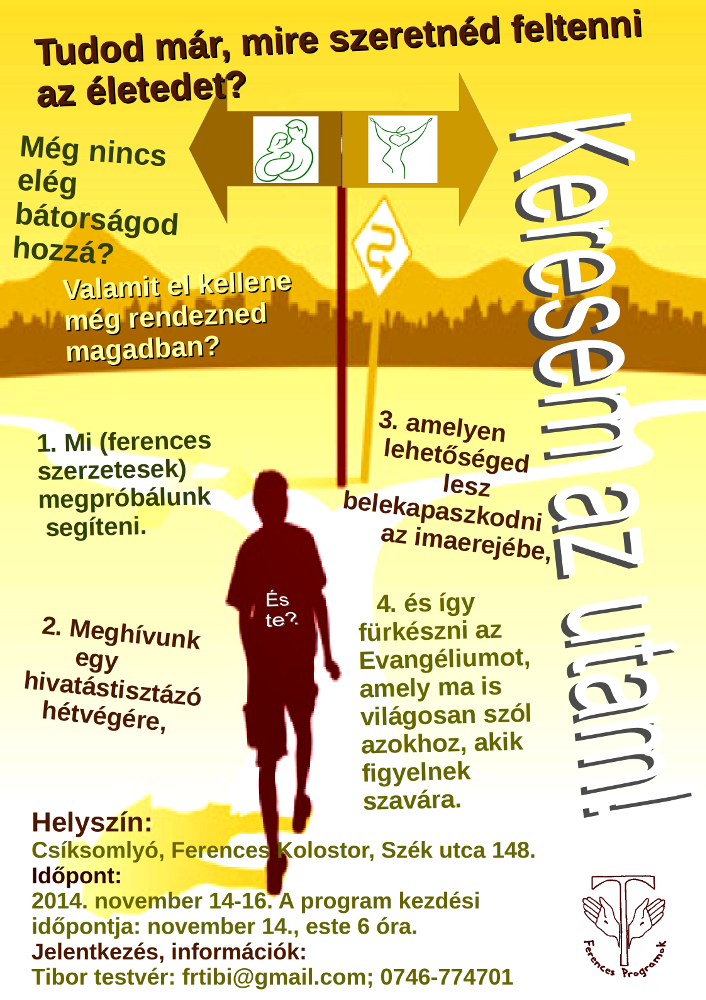 Ezeknek a gondolatoknak a jegyében kerül sor 2014. november 14–16. között a második Keresem az utam elnevezésű hivatástisztázó hétvégére a Csíksomlyói Ferences Kolostorban. A program november 14-én, pénteken este 6 órától kezdődik, és vasárnap délutánig tart. Az ebédről a rendház gondoskodik, a közös reggelikhez és vacsorákhoz valót a résztvevőknek kell állniuk. A szervező kolozsvári ferences testvéreknek az a kérésük, hogy mindenki hozzon magával Szentírást, füzetet, írószert, tisztálkodási felszerelést, hálózsákot, meleg ruhát és olyan cipőt, amelyben lehet barangolni, amennyiben azt az időjárás lehetővé teszi.