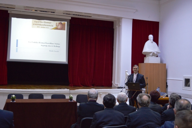 A konferencia nyitó előadását Holló László, az Erdélyi Római Katolikus Státus Alapítvány Igazgatótanácsának elnöke tartotta, Az Erdélyi Római Katolikus Státus tegnap, ma és holnap címmel. Előadásában ismertette a Státus kialakulásának történetét, működését, felépítését, célját, s egykori működésének alapjait. Külön kitért, s ismertette a rendszerváltás utáni helyzetet, s a mai állapotokat, sikereket és küzdelmeket az eltulajdonított javak visszaszerzése végett.