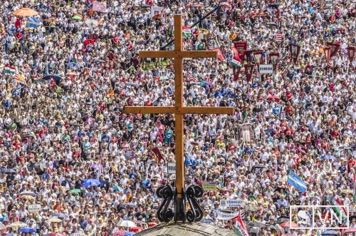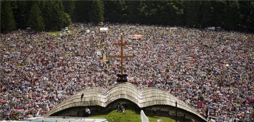 A Csíkszeredába vonaton, buszon vagy autóval érkezett zarándokok is gyalog tették meg a három kilométeres utat a Csíksomlyói Kegytemplomig, illetve kapaszkodtak fel a Kis- és Nagysomlyó-hegy közötti nyeregbe, ahol a pünkösdi búcsú szabadtéri szentmiséjét celebrálják.