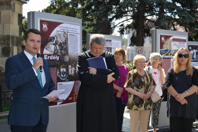 A hetedik Kolozsvári Magyar Napok a hétszáz éves Kolozsvár ünneplését helyezi a fókuszba – többek között ez hangzott el az ünnepségsorozat ökumenikus megnyitóján az augusztus 14-i, vasárnapi szentmisét követően a Szent Mihály-templomban. Kovács Sándor főesperes celebrálta a vallásos megnyitónak számító szentmisét, aminek végeztével Rácz Norbert unitárius, Bibza Gábor református és Fehér Attila evangélikus-lutheránus lelkész beszélt a közösségi ünnepről és ünneplésről. Ezt követően a templom bejáratánál hivatalosan is megnyitották a Márton Áron püspök emlékét idéző szabadtéri kiállítást. Itt az egybegyűlteket Gaál Gergely, a 2016-os Márton Áron Emlékév programbizottságának elnöke köszöntötte, elmondta a vándorkiállítás eddigi útjának tapasztalatait, majd ajánlotta a kolozsváriaknak is, akik kétnyelvű feliratok segítségével tudják nyomon követni többek között az ifjúságnevelő, a kisebbségben, kommunista szorításban, a Securitate célkeresztjében helytálló Márton Áron sorsát.