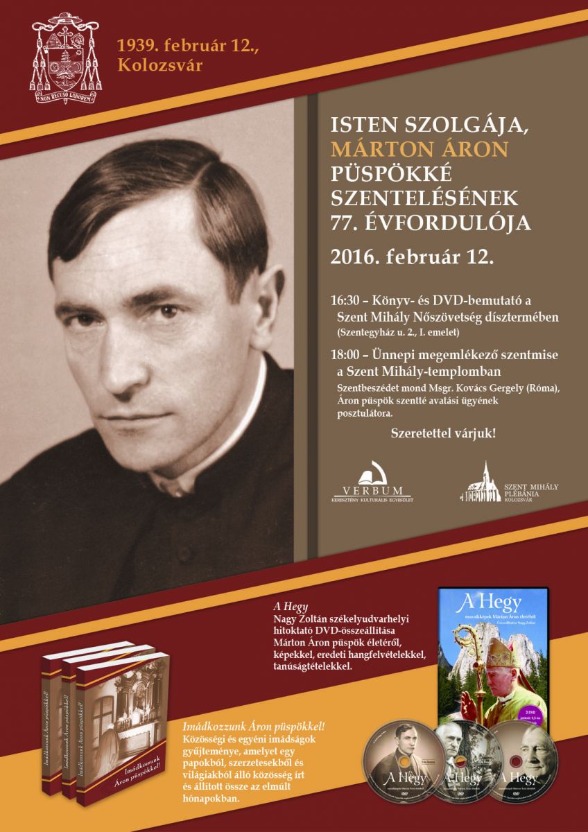 16 óra 30 perctől a Szent Mihály Plébánia és a Verbum Keresztény Kulturális Egyesület közös rendezvényén mutatják be az "Imádkozzunk Áron püspökkel!" imakönyvet és a 3 DVD-lemezből álló "A Hegy" című összeállítást, a Szent Mihály Nőszövetség dísztermében (Szentegyház u. 2., I. emelet).
