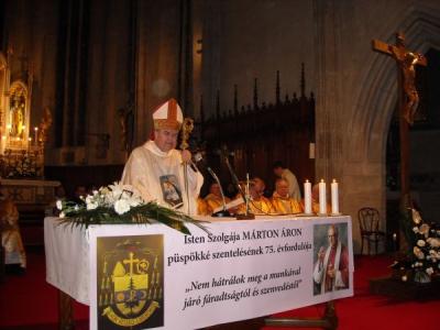 A Márton Áron püspökké szentelése 75. évfordulója előtt tisztelgő ünnepségsorozat záróeseménye a szentelés napján, február 12-én, a szentelés helyén, a kolozsvári Szent Mihály templomban tartott szentmise volt. A magasztos emlékezésen három püspök koncelebrált, főcelebráns Jakubinyi György gyulafehérvári érsek volt, emlékezni és ünnepelni eljött Csíkszeredából a gyulafehérvári főegyházmegye segédpüspöke, Tamás József és a váradi püspök, Böcskei László is. Magyarországról a piarista rend képviseletében Ruppert József érkezett, valamint a főegyházmegye egész területéről sok pap, a szülőfalu képviselete, más zarándokcsoportok Csíkszeredából és Székelyudvarhelyről, és természetesen a templomot zsúfolásig megtöltő kolozsváriak. A közösség ünnepléséhez a világi hatóságok tisztségviselői, politikai szervezetek képviselői csatlakoztak, Magyarország kolozsvári főkonzulja, Magdó János, és nem utolsó sorban a görögkatolikus egyház képviseletében a kolozsvár-szamosújvári püspök, Florentin Crihalmeanu.