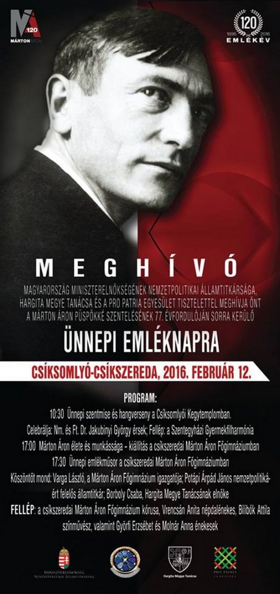 Magyarország Miniszterelnökségének Nemzetpolitikai Államtitkársága Márton Áron Emlékévet hirdetett a 2016-os évre. A kezdeményezéshez csatlakozott Hargita Megye Tanácsa is, egész évben szerveznek majd a nagy püspök emlékéhez méltó rendezvényeket a megyei tanács alintézményei, többek között a Hargita Megyei Hagyományőrzési Forrásközpont, a Gyergyószárhegyi Kulturális és Művészeti Központ, a Hargita Kiadóhivatal, emellett a Pro Patria Egyesület, Magyarország Csíkszeredai Főkonzulátusa és a Márton Áron Gimnázium. Az első ünnepi alkalom a püspökké szentelés 77. évfordulója: február 12-én Csíkszeredában emléknapot tartanak, amely az emlékév nyitórendezvénye is lesz. Az emléknap ünnepi szentmisével, majd és a Szentegyházi Gyermekfilharmónia hangversenyével kezdődik a csíksomlyói kegytemplomban de. fél 11-kor. A szentmise főcelebránsa Jakubinyi György érsek lesz. Ugyanzanap délután 5 órakor kiállítást nyitnak meg Márton Áron életéről a Márton Áron Főgimnázium MAGház klubtermében. A kiállítást Tamás József segédpüspök nyitja meg, a kiállítást Lázár Csilla, a csíkszentdomokosi Márton Áron Múzeum igazgatója ismerteti, köszöntőt mond Gaal Gergely, a Márton Áron Emlékév Programbizottság elnöke. Ezt követően fél hattól ünnepi emlékműsor kezdődik a főgimnázium dísztermében, amelyen fellép az iskola kórusa, Vrencsán Anita népdalénekes, Bilibók Attila színművész, Györfi Erzsébet és Molnár Anna énekes.