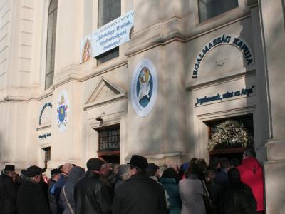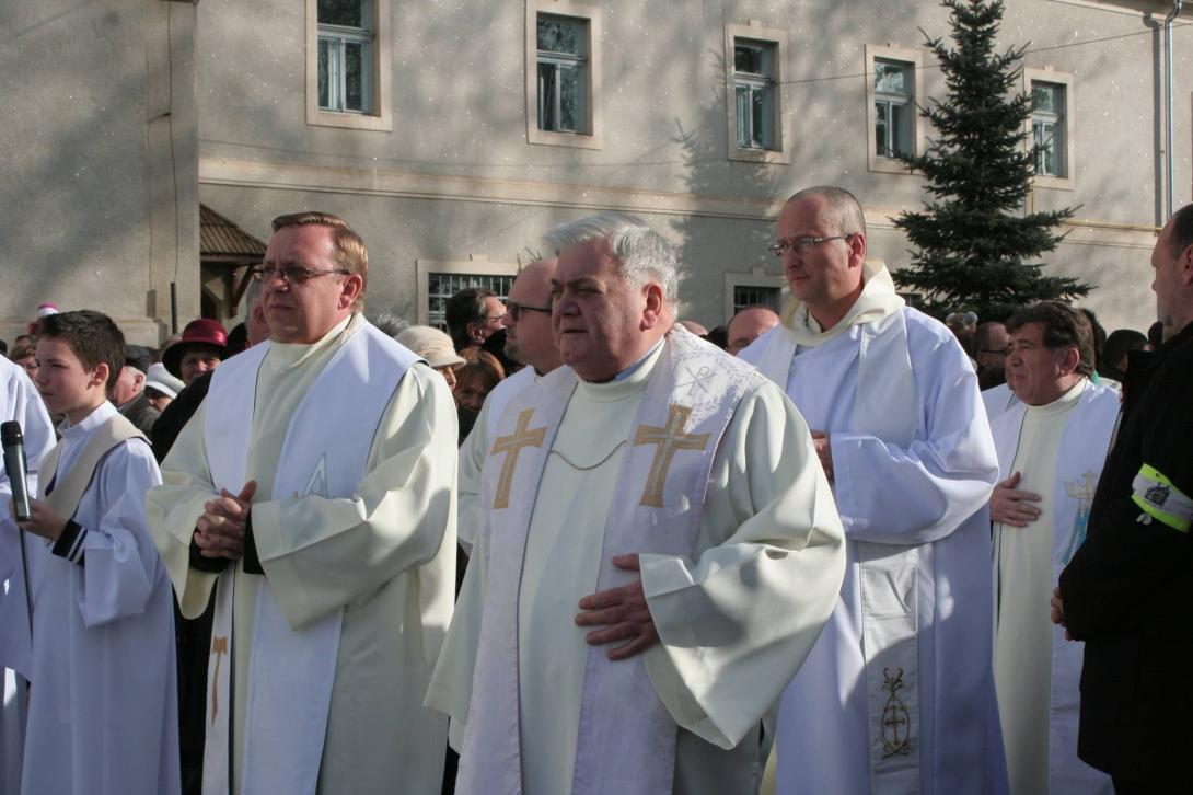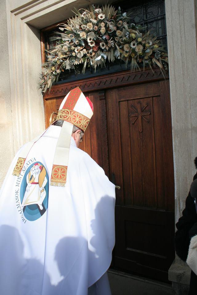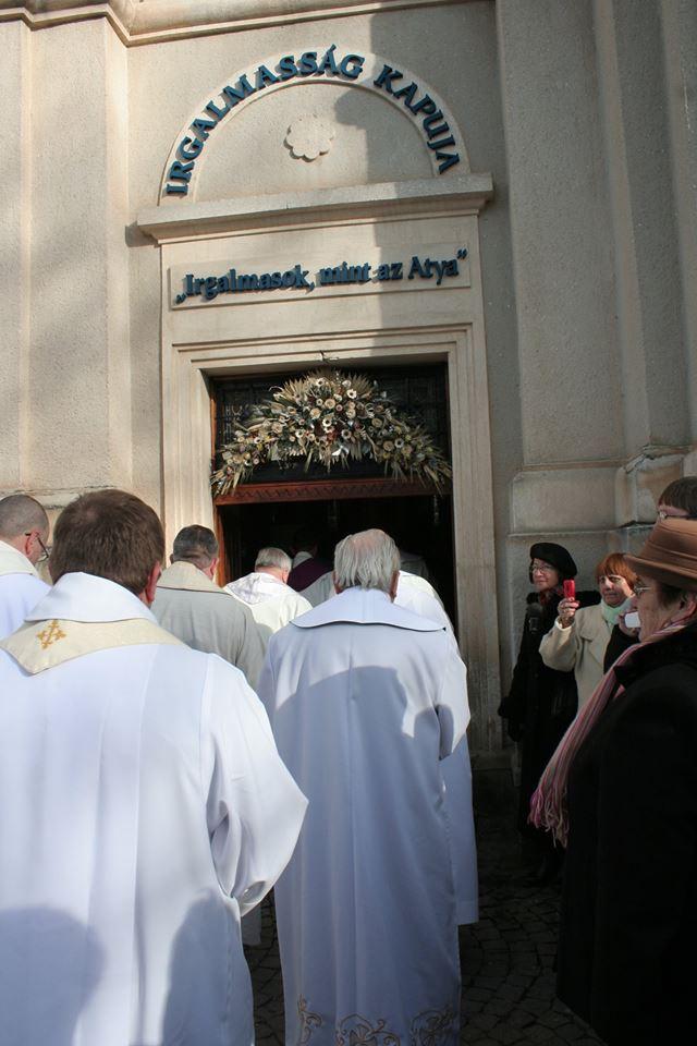 „A Mennyei Atya, a végtelenül irgalmas Isten nem hagyott fel azzal, hogy a történelemben különféle módon megismertesse isteni természetét. Jézus az Atya irgalmasságának arca. Az Atya irgalmassága a názáreti Jézusban vált elevenné, láthatóvá. Ez számunkra az öröm, a derűs nyugalom, a béke forrása és üdvösségünk feltétele. Vannak pillanatok, amikor még sürgetőbb meghívást kapunk arra, hogy tekintetünket az isteni irgalmasságra szegezzük annak érdekében, hogy mi magunk is az Atya irgalmasságának hatékony jeleivé váljunk. Ezért hirdette meg Ferenc szentatyánk az Irgalmasság rendkívüli jubileumát, mint alkalmas időt az egyház számára, hogy erősebbé és hatékonyabbá tegye a hívők tanúságtételét. Ezért a most elkezdődő Irgalmasság évében jusson el mindenkihez az irgalmasság hívó szava, és senki se maradjon közömbös az irgalmasság megtapasztalására szóló meghívás iránt” – mondta Jakubinyi György érsek a kegytemplom előtti téren összegyűlt híveknek. A szentkapu nyitását megelőző rövid szertartáson Tamás József püspök olvasta fel Ferenc pápának az Irgalmasság szentéve alkalmával kiadott bullájának magyar fordítását. Az Irgalmasság kapuját trombitazene felcsendülése mellett a főegyházmegye érseke nyitotta meg, és a teljes búcsú elnyerését is jelentő bejáraton ő lépett be elsőként a kegytemplomba. Őt követte a kegytemplom igazgatója, Urbán Erik ferences szerzetes, Tamás József püspök, Orbán Szabolcs ferences provinciális, és a jeles eseményen részt vevő papok, szerzetesek, majd a hívek sokasága is.