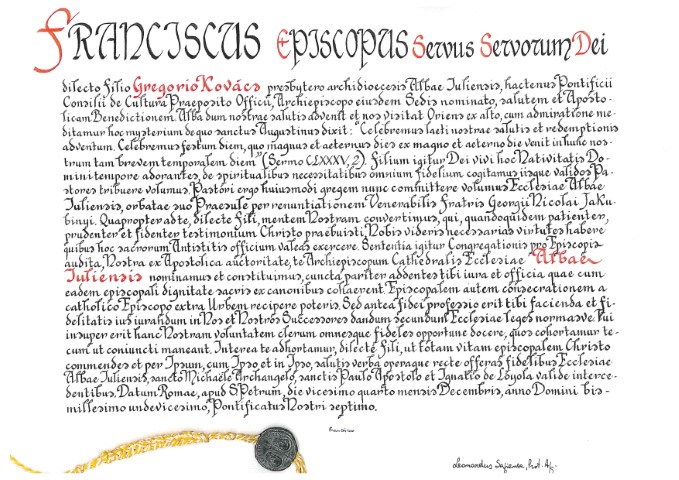 Miután tehát meghallgattuk a Püspöki Kongregáció véleményét, apostoli tekintélyünknél fogva, kinevezünk és megteszünk téged a Gyulafehérvári Egyház érsekének, megadva neked minden jogot és hivatalt, amelyek a szent kánonok alapján ezzel a püspöki méltósággal járnak. A püspökszentelést pedig Róma falain kívül bármely katolikus Püspöktől elnyerheted. Ám ezt megelőzően hitvallást és hűségesküt kell tenned Nekünk és Utódainknak az Egyház törvényei és szabályai szerint. Ezenfelül a te feladatod lesz, hogy erről a döntésünkről mind a klérust, mind pedig híveket kellőképpen értesítsd, akiket arra buzdítunk, hogy veled egységben maradjanak. Közben arra biztatunk téged, kedves Fiam, hogy egész püspöki életedet ajánld Krisztusnak. Őáltala, Ővele és Őbenne az üdvösség igéit és műveit pedig helyesen add át a Gyulafehérvári Egyház híveinek, Szent Mihály Főangyal, Szent Pál Apostol és Loyolai Szent Ignác hathatós közbenjárásának a segítségével.