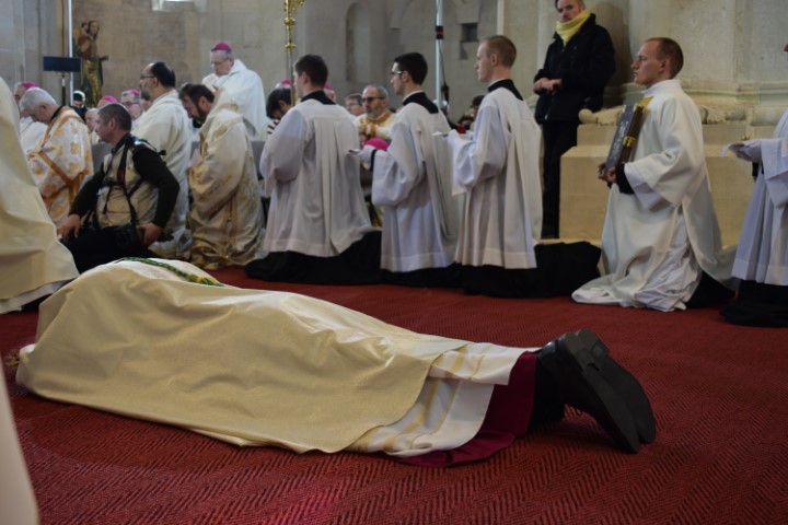 A Mindenszentek litániáját követően a főszentelő, majd valamennyi jelenlévő püspök kezét a szentelendő fejére tette; majd a főszentelő nyitott evangéliumos könyvet helyezett a szentelendő feje fölé, és elmondták a püspökké szentelési imádságot: „Most tehát áraszd e kiválasztottadra azt az erőt, amely tőled származik: a vezetés Szentlelkét, akit megadtál Jézus Krisztusnak, szeretett Fiadnak, ő pedig odaajándékozta szent apostolainak, akik Egyházat szerveztek szerte a világon, hogy az legyen a te szentélyed, és nevedet szüntelenül dicsőítsük és áldjuk benne.”