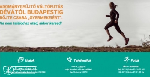 Adománygyűjtő futást tartanak június 23. és 27. között Dévától Budapestig a Böjte Csaba OFM vezette gyermekotthonok lakói megsegítésére. Az 500 kilométeres váltófutás előtt és alatt adományokat lehet felajánlani telefonhívással és utalással is.