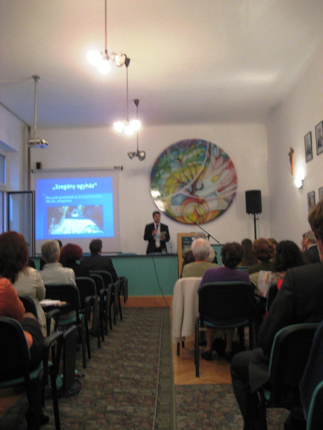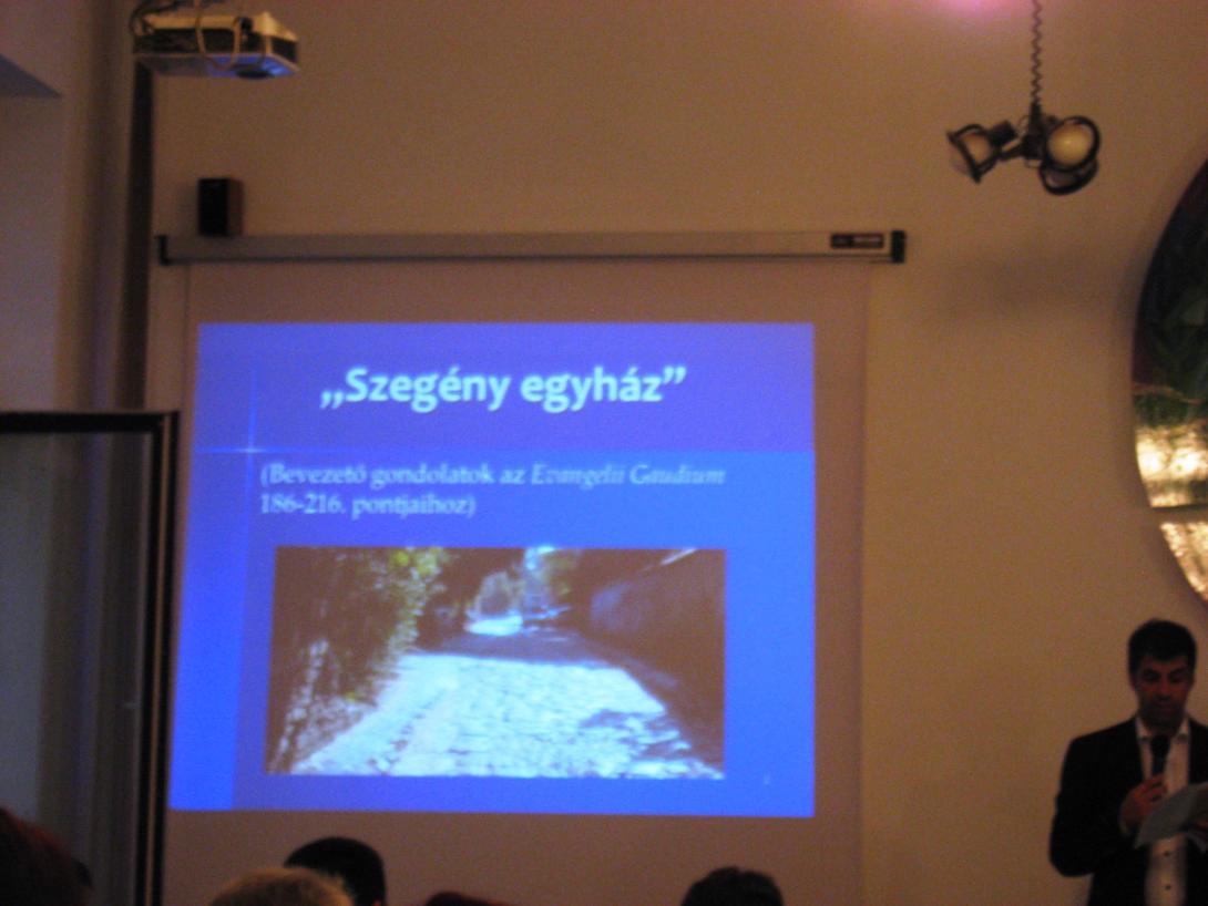 A zsinat dokumentumai közül a Lumen gentium első és hetedik fejezete foglalkozik a témával és kijelenti, hogy már a megváltás is szegénység közepette zajlott. Mai reflexióként az előadó a magyar Tomka Ferenc alakját, gondolatait mutatta fel, aki szerint ahogy Krisztusnak, úgy kell az egyháznak is tennie: meg kell találnia az egyensúlyt, a helyes arányt annak ellenére, hogy intézményként áll és cselekszik, míg Krisztus mint egyén beszélt és cselekedett.