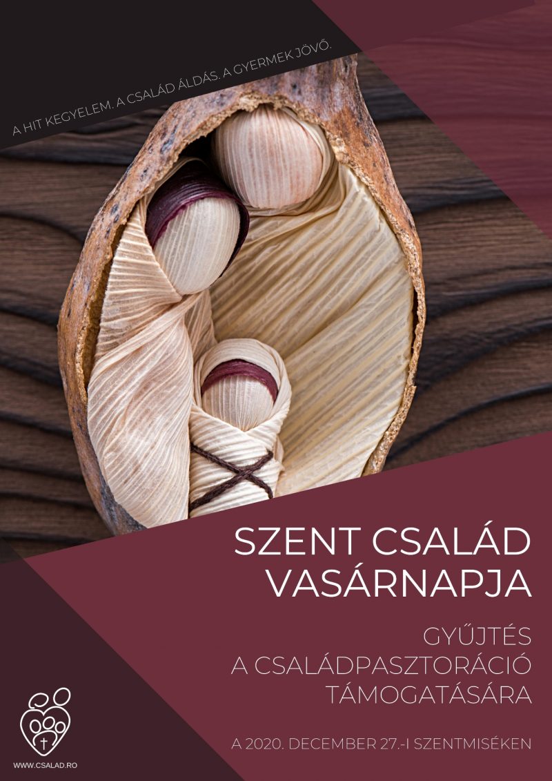 Megköszönve minden lelkipásztor és plébánia eddigi támogatását, a Főegyházmegyei családpasztoráció újbóli támogatására tartunk gyűjtést 2020. december 27-én, Szent Család vasárnapján. Segítsük egymást, hogy a családok ügyének szolgálata ne lankadjon ezekben az időkben sem. A begyült adományokat a Főegyházmegyei Családpasztorációs Iroda számlájára küldjük.