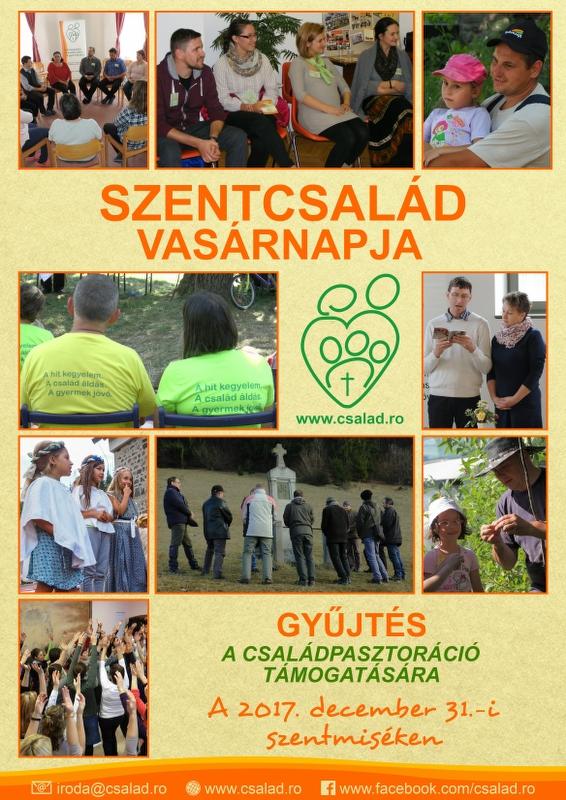 Szentcsalád Vasárnapjára készülve a názáreti szentcsaládot – Jézust, Máriát és Józsefet – szemléljük. Áldást kérünk Főegyházmegyénk családpasztorációjára (www.csalad.ro); áldást és további lelkesedést az erre kiképzést nyert, helyi vagy egyházmegyei szinten – ebben elkötelezett – papok és világiak számára. A kerületekben elindult jegyeskurzusok, a jegyesoktatásban résztvevő házaspárok képzése, családos tábor és konferencia mellett férjek/édesapák, feleségek/édes-anyák, apa/lánya és egyedülállók lelki napjait is tartjuk főegyházmegyei szinten. Idén óriásplakát-kampányt is indítottunk (egyelőre csak Sepsiszentgyörgyön) az abortuszban érintettek védelmében. A helyi önkormányzat bevonásával és önkénteseknek köszönhetően szakmai és lelki segítséget tudtunk nyújtani. Ha egy magzati életet mentettünk meg, értéke akkor is felbecsülhetetlen. Hargita, Kovászna és Maros megyében 2006-tól elindítottuk a Boldogabb Családokért iskolai programot is, melynek célja a családi életre nevelés osztályfőnöki órák keretében. Ma 55 településen, több mint 40 képzett önkéntes végzi ezt a jelentős munkát.