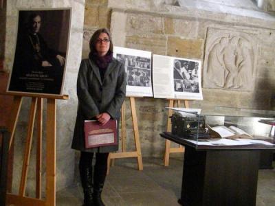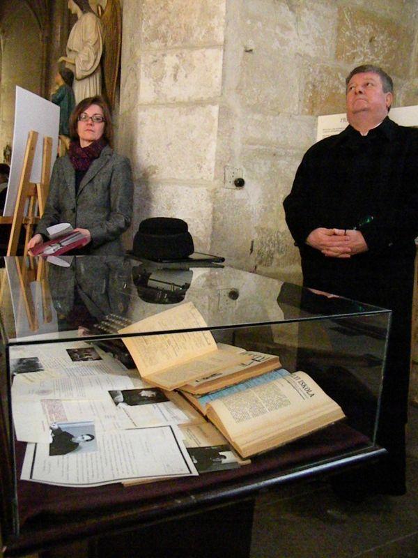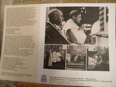 Az ünnepségsorozat keretében február 10-én délelőtt kiállítás nyílt Márton Áron tiszteletére a Szent Mihály templom keresztelőkápolnájában. A kiállítás anyagát Hegedüs Enikő művészettörténész állította össze, és Kovács Sándor főesperes-plébános bevezetője után ismertette a kiállított anyagot. „A kolozsvári püspökszentelés nagy eseményére, Márton Áron püspök személyére kívánjuk ezzel a kiállítás is ráirányítani a figyelmet” – mondta. A falak mentén felállított pannókon fotóanyag, az üvegtárlókban emléktárgyak és kéziratok, könyvek, folyóiratok láthatóak. Ezek közt említendő az írásait is magába foglaló néhány folyóiratszám az Erdélyi Iskola, A Hírnök, az Erdélyi Tudósító című lapokból, a plébánossá való megválasztása után, Vorbuhner püspök és Gajdátsy Béla irodaigazgató által aláírt – 1938. augusztus 21-én kelt – plébánosi kinevezése, amelyet a plébániai levéltárban őriznek, a püspökké szentelés programját is láthatjuk a tárlóban, amely már előző nap, február 11-én elkezdődött. Kiállították a február 12-én reggel 9 órakor kezdődő szertartás meghívó leveleit a Kolping, a Hölgy Kongregáció, a Szoc. Misszió, az Oltárgyelet, a Kat. Kör számára, belépő jegyek is láthatóak (dr. Karda Mihály és Karda Mihályné belépőjegye Domokos Pál Péter hagyatékából.) Hegedüs Enikő további érdekességekre is felhívta a figyelmet: „érdekesség, hogy külön étlapot is nyomtattak a díszebéd meghívottjainak. Jakab Antal mint segédlelkész neve szerepel az egyiken. A püspökké szentelés szertartásról és köszöntésekről, az ÚJ PÜSPÖK iránt megnyilvánuló szeretet kifejezéseiről, szintén láthatunk nyomtatványokat. A Szentelik a püspököt említett kiadvány részletes képet ad az ünnepségről. Püspöki pileolusa pedig jelenlétét idézi. A harmadik tárlóban XI. Piusz pápa apostoli levelének másolatát láthatjuk, amellyel Márton Áront gyulafehérvári püspökké nevezi ki. Az eredeti, ólompecsétes bullát a gyulafehérvári Érseki Levéltárban őrzi. Címerét a neves erdélyi heraldikus, Keöpeczi Sebestyén József tervezte 1939. február-márciusában. Az Erdély címerével, a vármegyék, és Erdély uralkodóinak címereivel egyesített püspöki címert láthatjuk itt.”