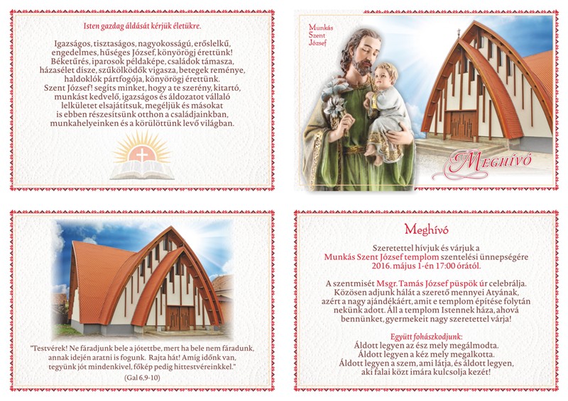 Az ünnepélyes alkalomra készített meghívóban hálaadásra biztatnak: „Áll a templom, Istennek hála, ahová bennünket, gyermekeit nagy szeretettel várja.” A meghívóban alkalomhoz illő fohász is olvasható: „Áldott legyen az ész, mely megálmodta. Áldott legyen a kéz, mely megalkotta. Áldott legyen a szem, ami látja, és áldott legyen, aki falai közt imára kulcsolja kezét.”