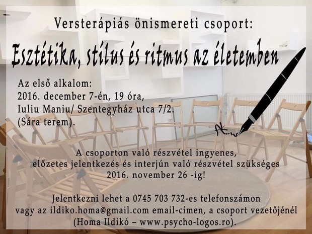 Egy 10 alkalomból álló önismereti csoport indul Kolozsváron. A kéthetente sorra kerülő alkalmakon megismerkedhetsz a világirodalom „szép és míves” verseivel, amelyek elvezetnek a saját „élet-versed” jobb megértéséhez. Az első alkalomra 2016. december 7-én este 7 órakor kerül sor.