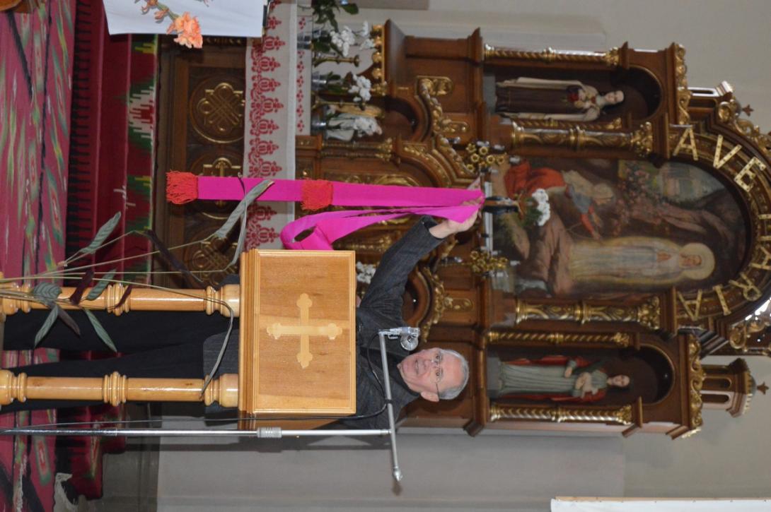 Az első állomás Csíkdánfalva, ahol Bara Ferenc kerületi főesperes a plébános, ő gelencei származású, Márton Áron utolsó titkára volt. A zarándokokkal megosztotta személyes élményeit. 1978 júniusában Bara Ferenc Bálint Lajos későbbi érsek káplánja volt Csíkszentdomokoson, éppen fahasogatás közben volt, amikor a postás két levéllel érkezett a plébániára. Márton Áron augusztus 1-jétől titkárává nevezte ki a huszonhat éves káplánt: a 82 éves, beteg főpap titkára lett. Életre szóló élmény maradt az ifjú titkárnak a dús, bozontos szemöldökű püspök által nyújtott atyai fogadtatás, pár napon belül tapasztalhatta határozottságát, bölcs kiállását az egyházat érintő ügyekben, amikor nem volt hajlandó alkudozni a Kultuszminisztérium embereivel. Ereklyeként őrzi, s büszkén mutatja az egykori titkár azt a vörös cingulumot, mely Márton Áron szegénységéről árulkodik: több mint harminc stoppolás van az ünnepi cingulumon.