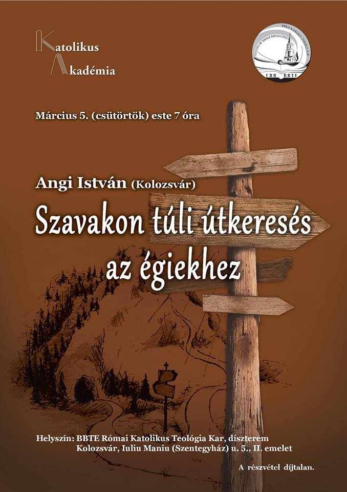 A Babes-Bolyai Tudományegyetem RK Teológia Kara szervezésében működő Katolikus Akadémia következő előadását Angi István zeneesztéta tartja Szavakon túli útkeresés az égiekhez címen március 5-én, csütörtökön este 7 órakor a Szentegyház (I. Maniu) utca 5. szám alatt, a kar épületében, a II. emeleti díszteremben. Minden érdeklődőt szeretettel várnak a szervezők!
