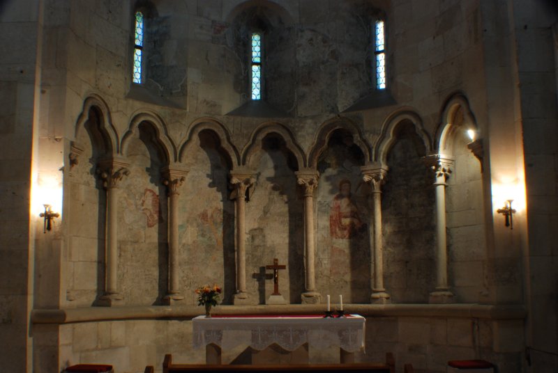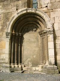 Az új sekrestye és a mellékhajó szára között áll a déli mellékapszis szörnyalakokkal díszített románkori építménye.