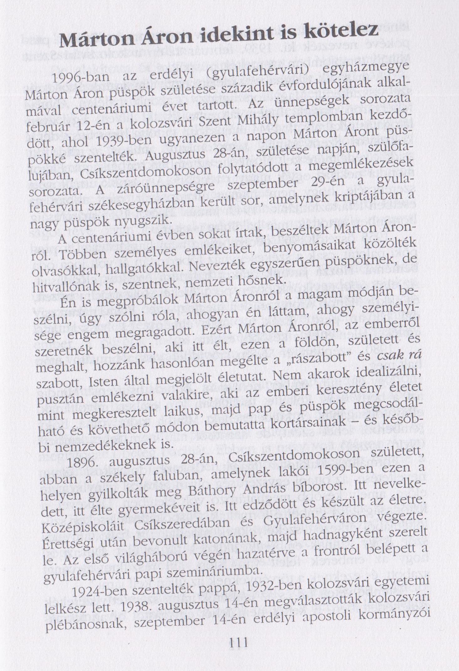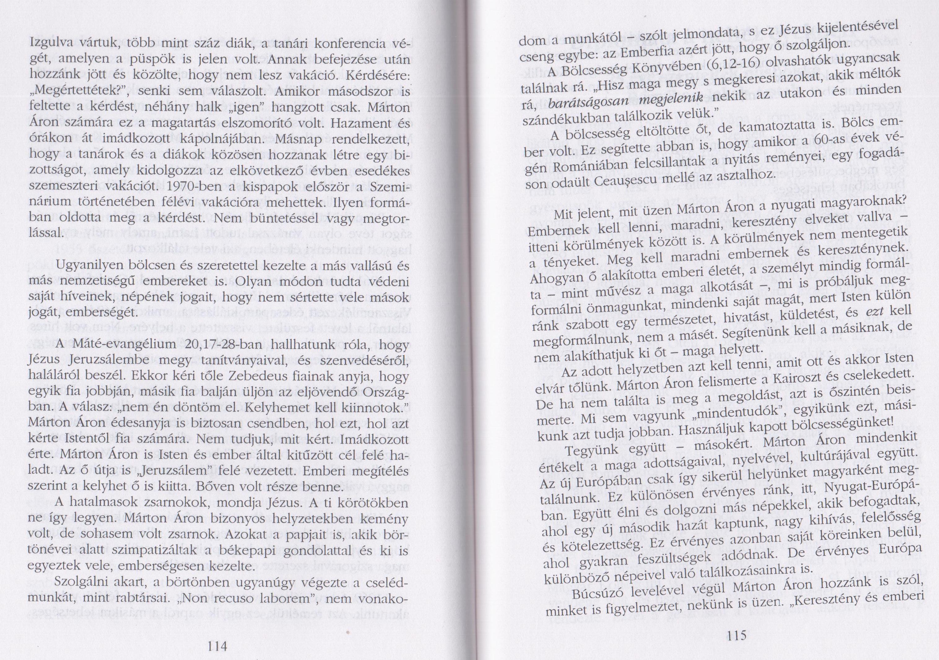 VENCSER László, Márton Áron idekint is kötelez. Szentbeszéd, München, Damenstift-templom, 1996. november 10., in: "Felelős szabadság, STÁTUS Könyvkiadó, Csíkszereda 1998, 111-116. old. 1 2 3 4