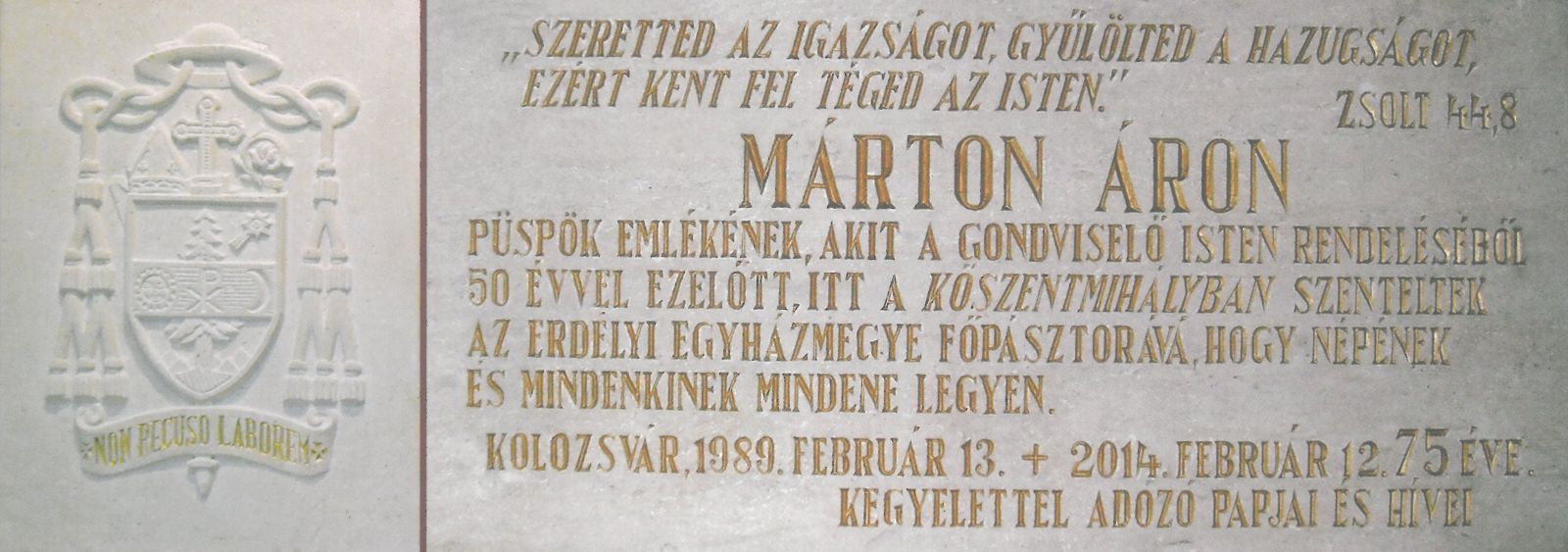- 2014. február 12-én, szerdán, a Márton Áron püspökké szentelésének 75. évfodulóján bemutatott és délután 6 órakor kezdődő ünnepi szentmise végén áldotta meg Jakubinyi György érsek a templombejárattól balra elhelyezett püspöki címert (Venczel Árpád műve) és emléktáblát. Ezek a püspökké szentelés 50. évfordulójára készültek, de 1989 februárjában elhelyezésükre nem kerülhetett sor. Fénykép az emléktábláról és püspöki címerről [új]