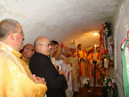 Mint minden szentmise végén, így most is elhangzott Márton Áron püspök boldoggá avatásáért fohászkodó imádság. A pápai himnusz és nemzeti ima után a papság a zarándokok kíséretével levonult a székesegyház kriptájába Márton Áron püspök sírjához.