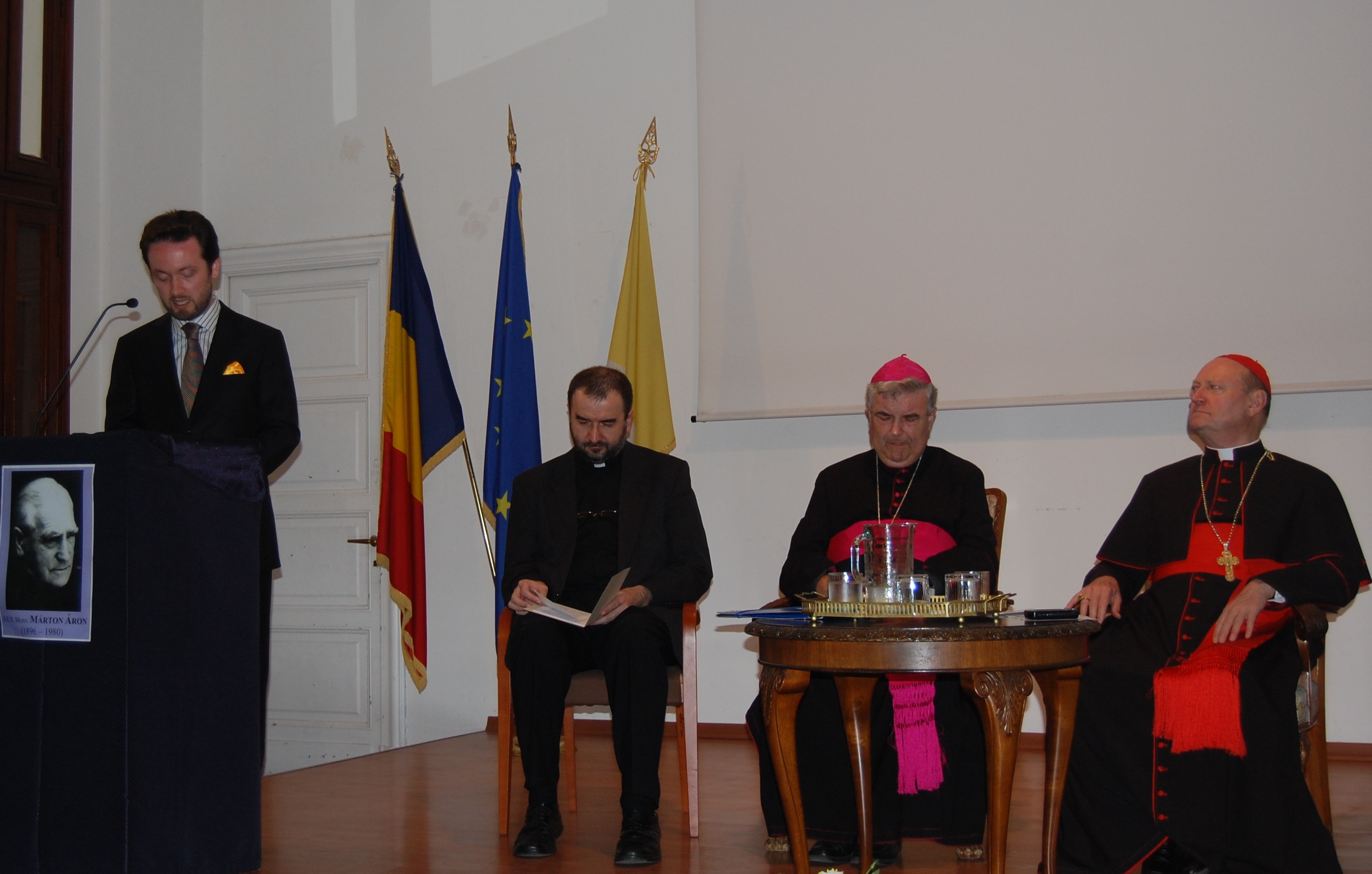 Pe 11 octombrie 2012, la ora 18, sala festivă a Academiei Române din Roma, era deja plină, întrecând chiar aşteptările organizatorilor, de reprezentanții de rang înalt ai instituțiilor Vaticanului și al Curiei Romane, ambasadori și reprezentanți ai unor organizații internaționale acreditați la Sfântul Scaun, reprezentanți ai instituțiilor de cultură și ai culturii din Roma, postulatori ai unor cauze de beatificare, preoți care slujesc și trăiesc în Roma, seminariști, călugări, călugărițe și alți interesați. Evenimentul în limba italiană a fost organizat prin colaborarea Ambasadei României pe lângă Sfântul Scaun cu Consiliul Pontifical pentru Cultură (Ministerul Culturii al Vaticanului), la inițiativa postulatorului cauzei de beatificare a lui Márton Áron și cu sprijinul arhiepiscopului de Alba Iulia ÎPS György Jakubinyi.