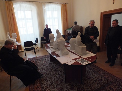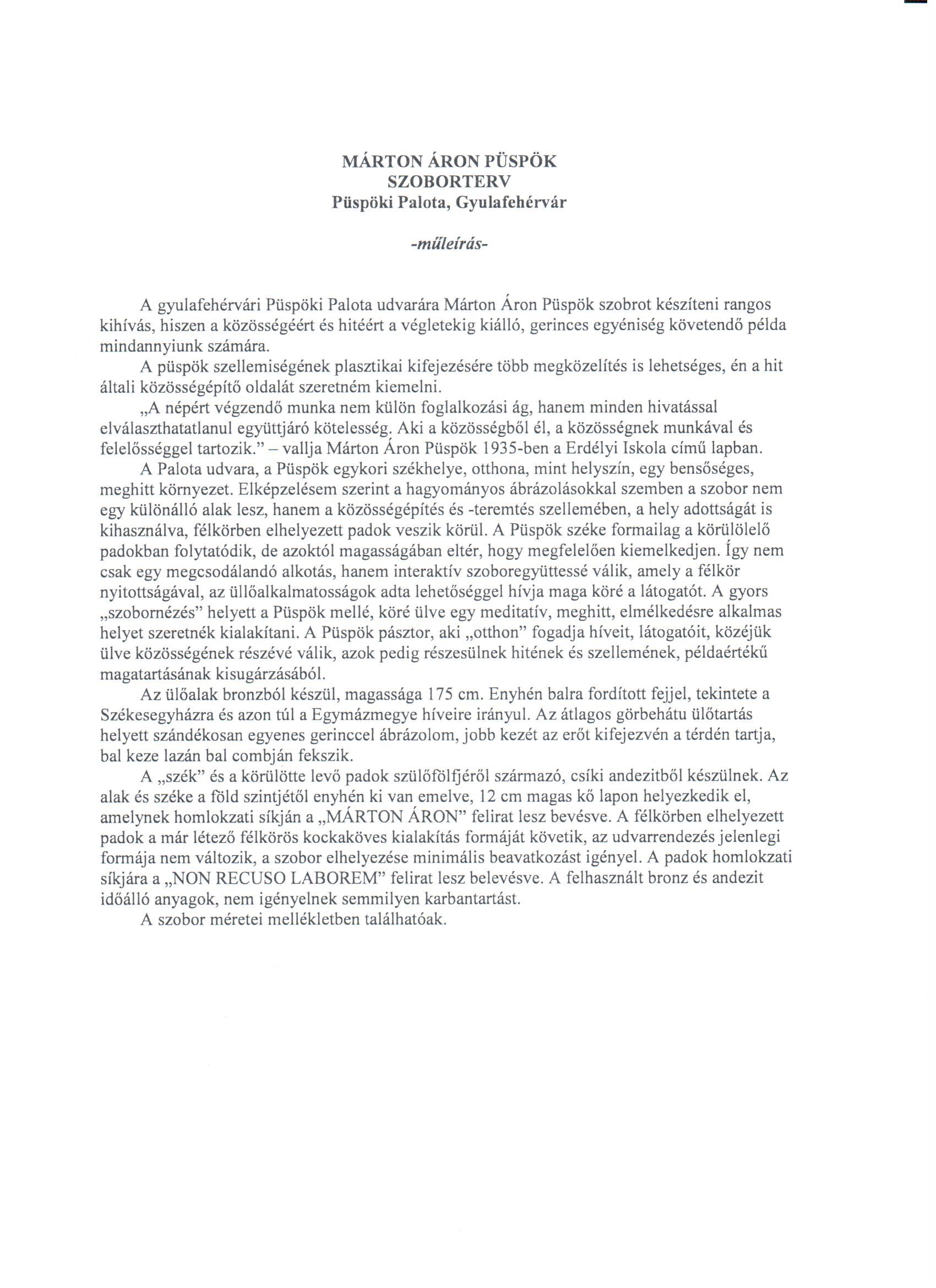 MÁRTON ÁRON püspök emlékére az egykori székhelyén és kényszerlakhelyén (a gyulafehérvári érseki palota udvarán) felállítandó szobor megvalósítására kiírt, meghívásos pályázatra hét alkotó küldött be pályamunkát.