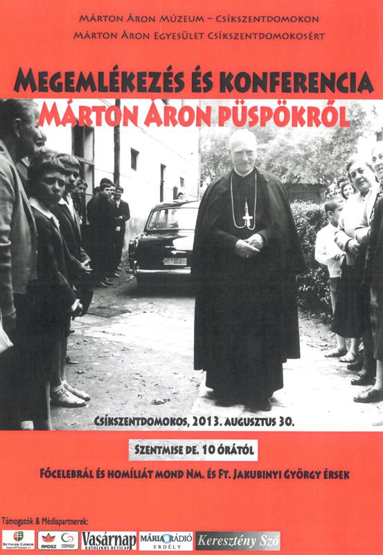 2013. augusztus 30-án, pénteken Csíkszentdomokoson Márton Áron püspökre emlékezünk. Az ünnepség délelőtt tíz órakor kezdődik szentmisével, melyet Jakubinyi György érsek és Tamás József segédpüspök mutat be a jelen lévő papokkal közösen. Ezt követően a Községháza dísztermében vetített képes előadások hangzanak el Márton Áron püspök bérmaútjairól, a kortárs művészekkel való kapcsolatáról, a szülőfalujában élő emlékekről. Ugyanitt egy gyulafehérvári diakónus bemutatja az érseki levéltárban található gazdag Márton Áron fénykép-hagyatékot, és részletek hallhatók a Mária Rádió által gyűjtött kortársi visszaemlékezésekből is. A rendezvény végeztével lehetőség nyílik meglátogatni a helyi Márton Áron Múzeumot.