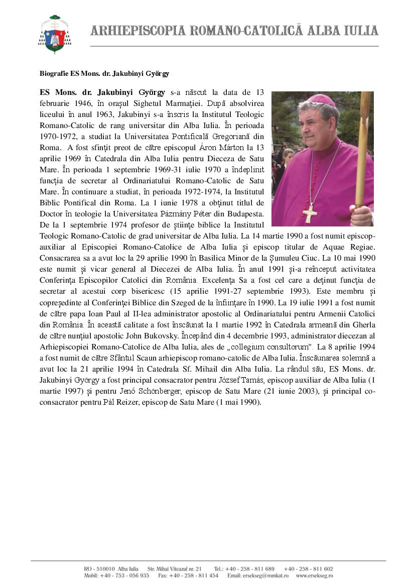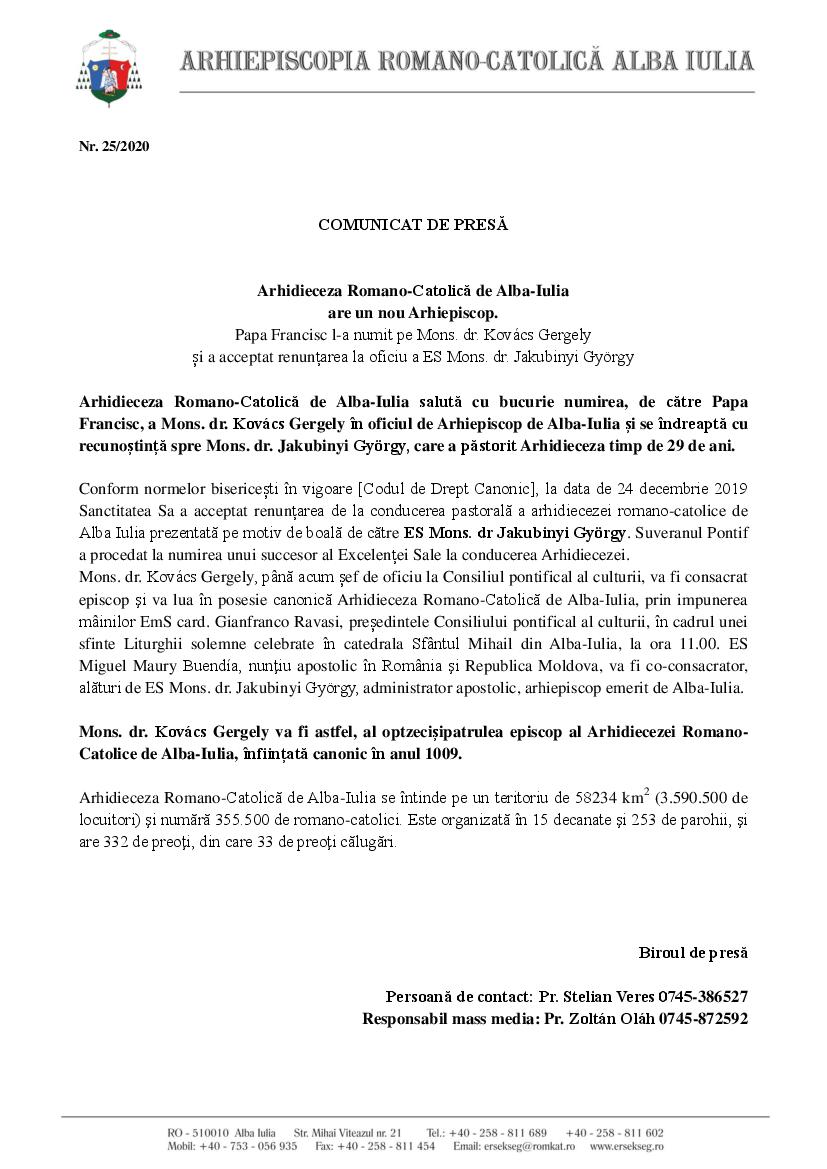 Conform normelor bisericești în vigoare [Codul de Drept Canonic], la data de 24 decembrie 2019 Sanctitatea Sa a acceptat renunțarea de la conducerea pastorală a arhidiecezei romano-catolice de Alba Iulia prezentată pe motiv de boală de către ES Mons. dr Jakubinyi György. Suveranul Pontif a procedat la numirea unui succesor al Excelenței Sale la conducerea Arhidiecezei.