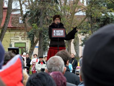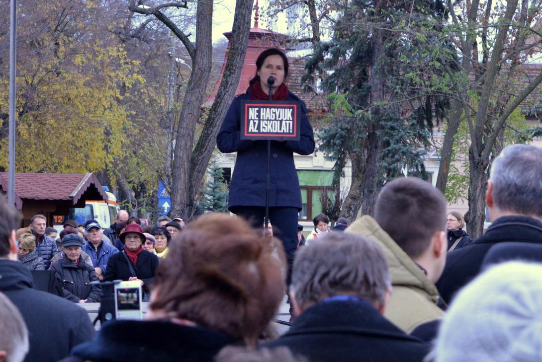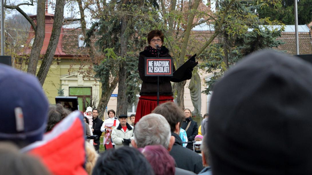Kali Edina, elevă în clasa a XII-a, s-a adresat colegilor și manifestanților cu poezia Cu tine este Dumnezeu de Ady Endre, apoi a descris, într-o retrospectivă a ultimilor patru ani, realizarea treptată a visului referitor la școala catolică și a cerut apărarea acesteia.